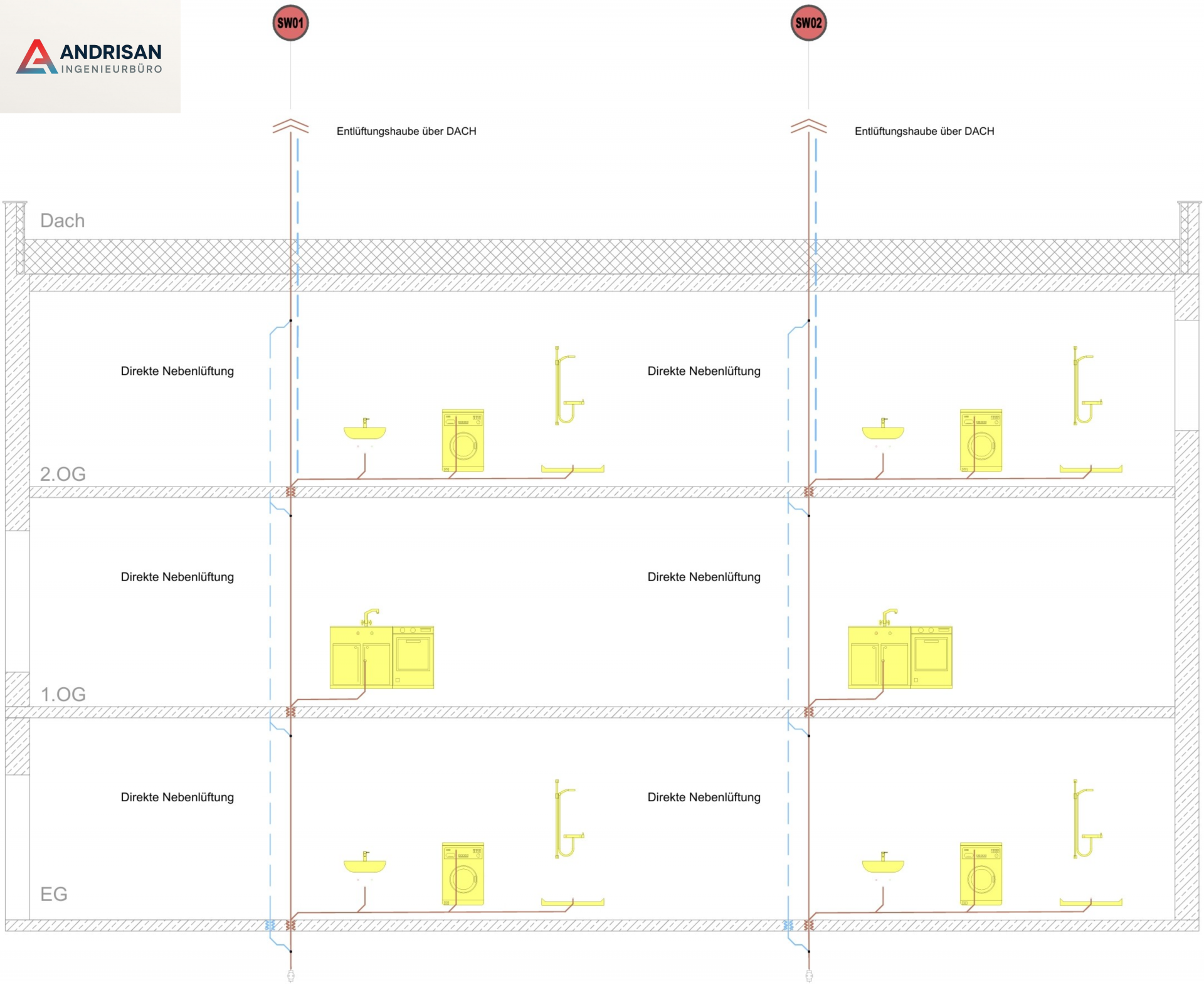 CAD-Grundrisse und Strang-/Schemazeichnungen für Wohn- und Gewerbeobjekte zur Abstimmung der Leitungsführung und Anschlussstellen.Lüftung von Abwasserleitungen